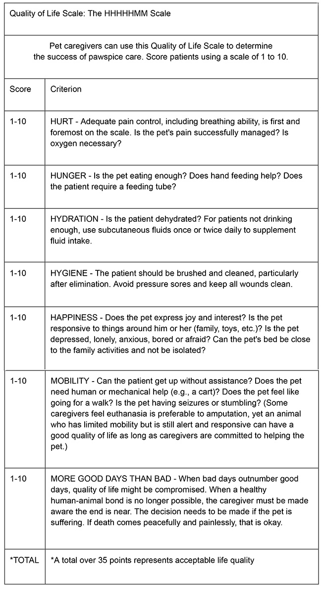 - A good tool for determining when it is time to consider euthanasia is the Quality of Life Scale developed by Dr. Alice Villalobos,
